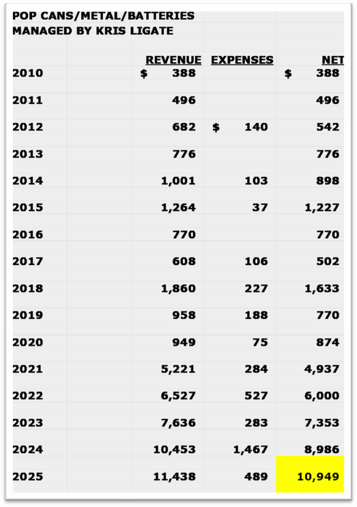 - Metal and Cans!! 2025 was our biggest year ever in proceeds from Can Sorts, Metal collections, and more that Kris coordinates for us!